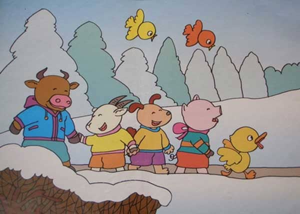 在大家的努力下,一条雪中小路出来了,小猪、小狗、小鸭,还有小羊、小牛都稳稳当当地走了过去