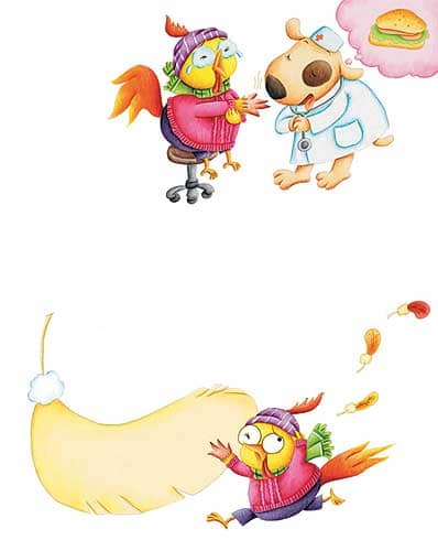 火帽子被送进医院里,小狗医生跑来瞧,他把鼻子凑近小公鸡烧伤的翅膀,一边闻,一边叫:“嗨,哪儿来的鸡肉汉堡包,好像进了麦当劳!好想吃个烤鸡翅,好想吃个汉堡包!”