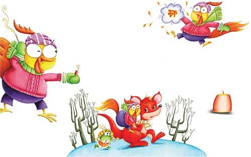 火帽子小公鸡戴上手套,把鞭炮拿在手中,说:“我敢拿着鞭炮放,不信你们瞧!”