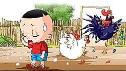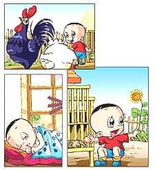 大头儿子到乡下爷爷奶奶家里去玩,发现他们的院子里多出一只用木条打成的鸡窝,鸡窝方方整整的,前面有扇门可以往上一抽。大头儿子赶紧跑过去拉开门,他还没来得及看哩,就从里面走出来一只大大的黑公鸡、一只胖胖的白母鸡。以后每天早晨,大头儿子都是被大公鸡“喔喔”叫醒的;而每天下午,胖母鸡会在鸡窝里给大头儿子下一个红扑扑的大鸡蛋。