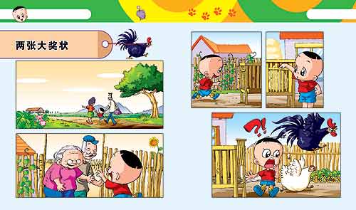 “那是母鸡的奖状!不能吃的!”大头儿子追着大公鸡直叫,可大公鸡不听他的话,反而越啄越凶。