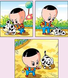 大头儿子的斑点狗简直已经被大狼狗吓傻掉了,它一出门就东张西望,还爱躲在大头儿子身后走,好象知道大头儿子不怕大狼狗。大头儿子很生气,就绕到斑点狗的后面使劲往前推它的屁股:“什么男子汉呀!你再这样我就叫你胆小鬼!”可斑点狗还是不肯跑在前面,它干脆趴在地上赖着不走了。