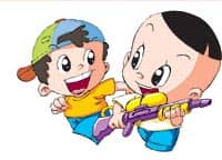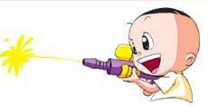 大头儿子先把橘子水装进水枪打给奶牛宝宝吃,然后是葡萄汁、豆浆、可乐……大头儿子挑靠近奶牛宝宝的地方,瞄准以后使劲打,打得几头奶牛宝宝躲过来、躲过去。“别怕别怕,这是好吃的、有营养的东西,快把嘴张大了呀!”大头儿子一边打,一边连连说。