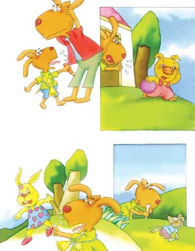 6.草莓兔让丁当狗把头发梳整齐,丁当狗大叫:“我就不梳,就不梳,我是乱头发狗,我是疯狗!”丁当狗的声音太大,吓得草莓兔拔腿就跑。