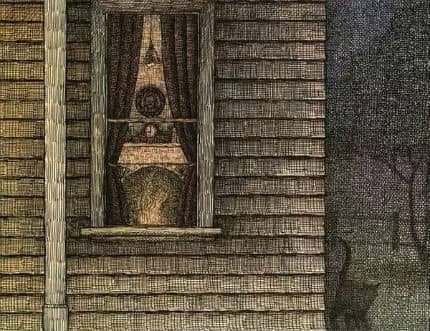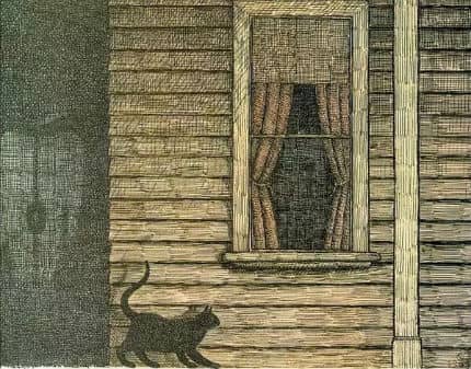 一天晚上,夜半猫跳到窗台上,在玻璃上磨磨蹭蹭。他的双眼像明亮的灯火一样,皮毛在夜空下闪闪发光。