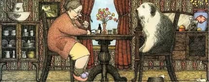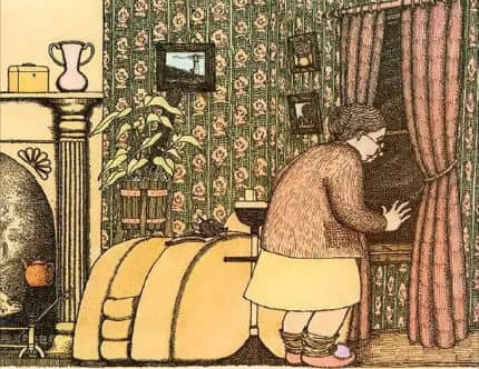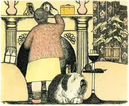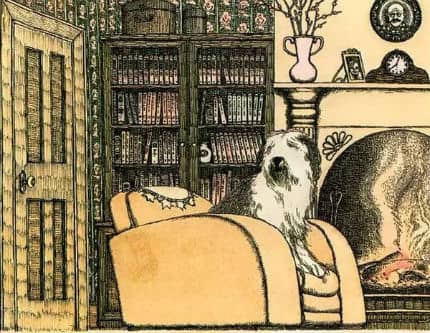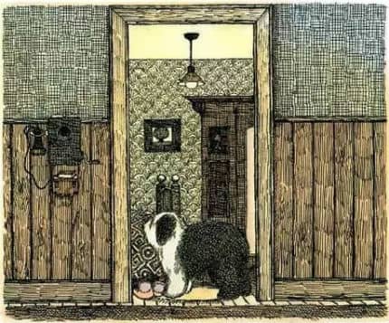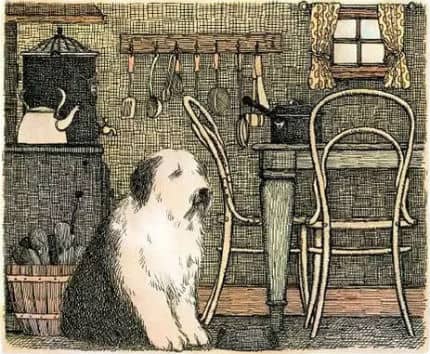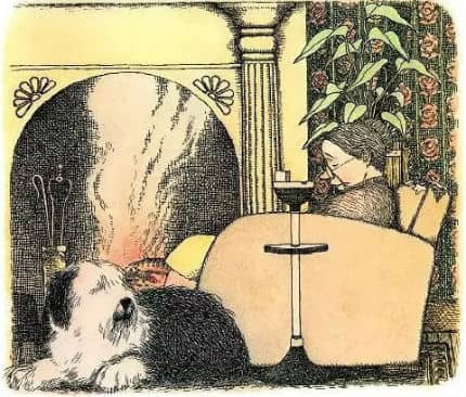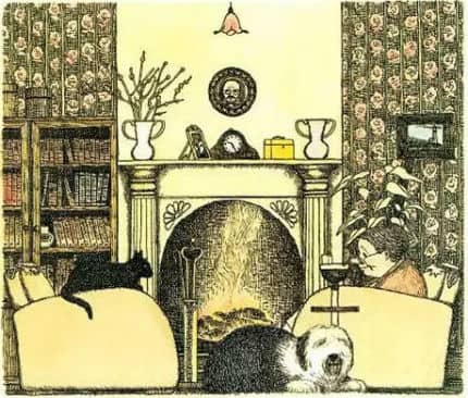 就这样,露丝太太安详地坐在火炉边,江布朗静静地趴在地上,夜半猫靠在沙发的扶手上……