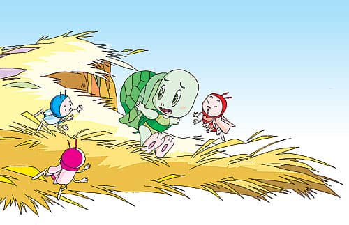 小乌龟找到了掉在草丛里的大背壳,用了很大的力气才把它重新背在身上。