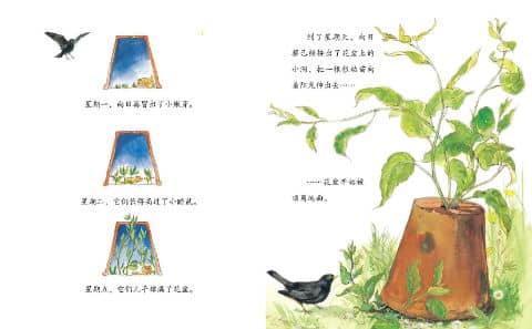 到了星期天,向日葵已经挤出了花盆上的小洞,把一根根幼苗向着阳光伸出去……