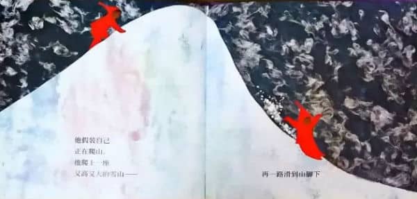 他假装自己正在爬山。他爬上一座又高又大的雪山——再一路滑到山脚下。