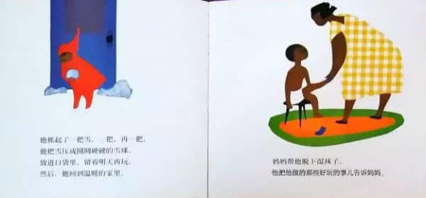 妈妈帮他脱下湿袜子,他把他做的那些好玩的事儿告诉妈妈。