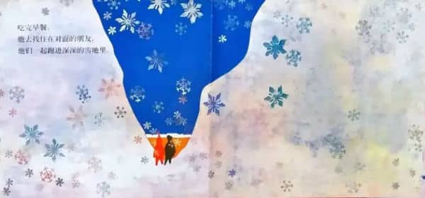 吃完早餐,他去找住在对面的朋友,他们一起跑进深深的雪地里。