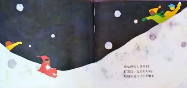 他觉得和大哥哥们打雪仗一定会很好玩,但他知道自己还不够大。