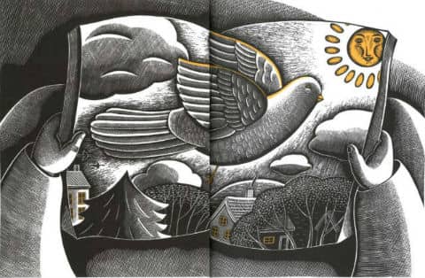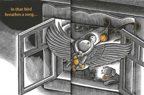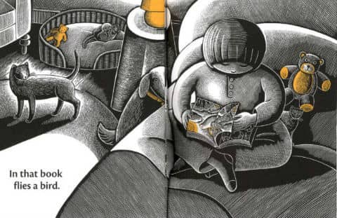 书里飞着一只鸟儿。