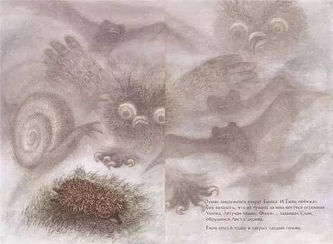 迷雾把小刺猬弄得晕头转向。他跑了起来,觉得身后跟着蜗牛、蝙蝠和猫头鹰……大象大声喘气,树叶还会从头上砸下来。