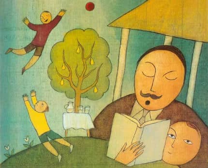 晚上上床前,小男孩的爸爸在门廊里给他读了一个故事。
