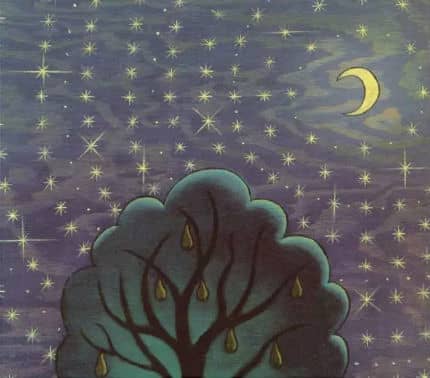天色已晚,暗紫色的天空中,在梨树梢上,一弯新月正朗朗地照耀大地。