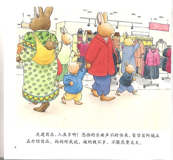 走进商店,人真多呀!悠扬的乐曲不时传来,售货员阿姨正在介绍商品。妈妈对我说,她的钱不多,不能花费太大。