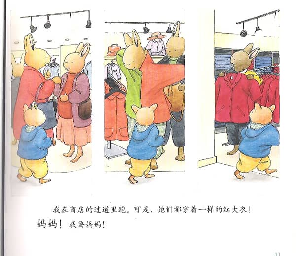 我在商店的过道里跑。可是,她们都穿着红大衣!妈妈,我要妈妈!