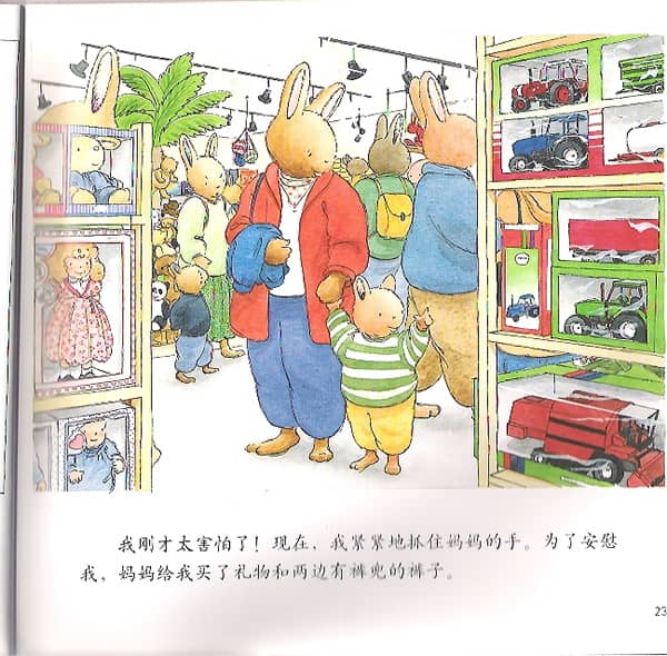 我刚才太害怕了!现在,我紧紧地抓住妈妈的手。为了安慰我,漫妈妈给我买了礼物和两边有裤兜的裤子。