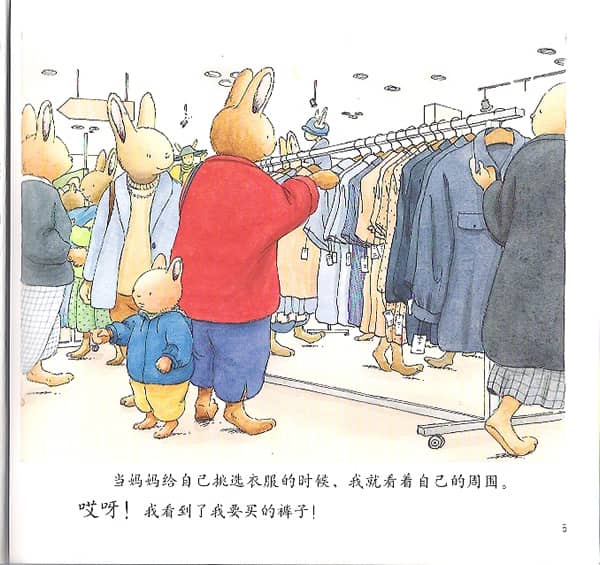 当妈妈给自己挑选衣服的时候,我就看着自己的周围,哎呀!我看到了我要买的裤子!