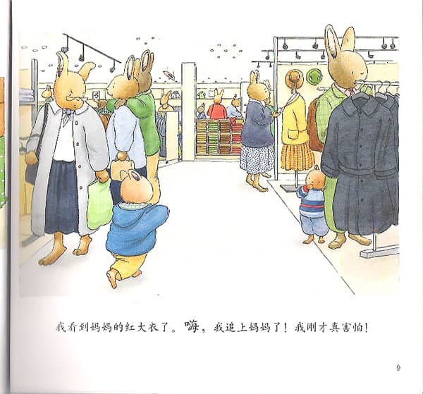 我看到妈妈的红大衣了,嗨!我追上妈妈了!我刚才真害怕!