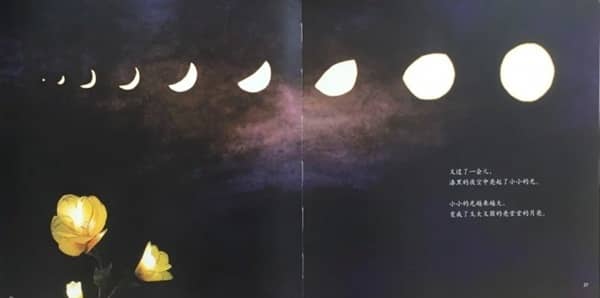 过了一会儿,漆黑的夜空中亮起了小小的光。小小的光越来越大,变成了又大又圆的光亮亮的月亮。