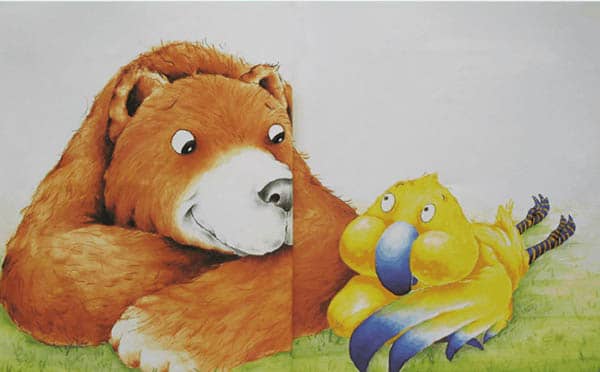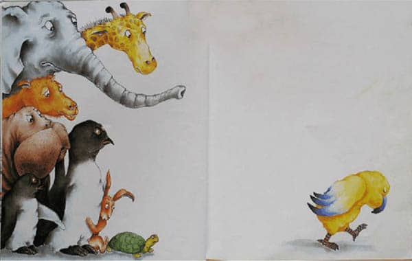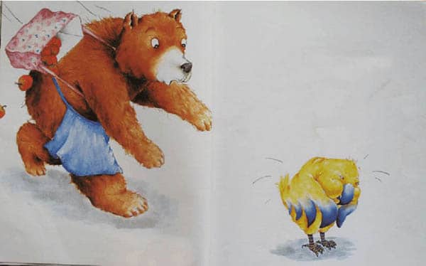 “可是你的毛不是黄色的。你也没有长着像我这样的翅膀,胖嘟嘟的脸蛋和有条纹的脚!”