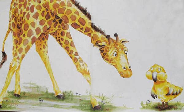 “真对不起,”长颈鹿太太叹了一口气,“可是我不像你那样长着一对翅膀呀。”