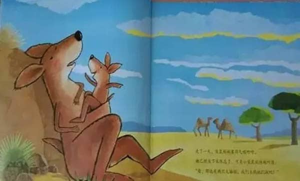 走了一天,袋鼠妈妈累得气喘吁吁,她已经坐下来休息了。可是小袋鼠欢快地叫道:“看,那边有两只大骆驼,我们去找他们玩吧!”