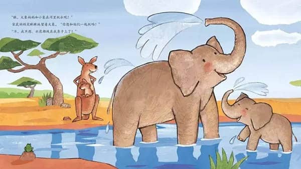 “瞧,大象妈妈和小象在河里玩水呢!”