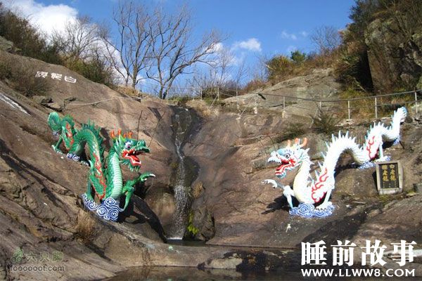 舟山岛西岸有个海湾叫岑港。岑港有座高山,山水倾泻下来,犹如百尺白布悬挂在峭壁上,煞是壮观。年复一年,在岭脚边冲出一口深深的石潭,名叫“龙潭”。