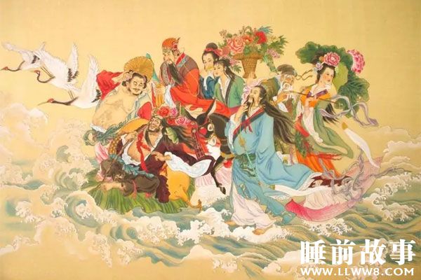 有一天八仙要到东海去游蓬莱岛。本来,腾云驾雾,一眨眼就可到,可是吕纯阳偏偏别出心裁,提出要乘船过海,观赏海景。他拿来铁拐李的拐杖,往海里一抛,喝声"变″,顿时变成一艘宽敞、漂亮的大龙船,八位大仙坐船观景,喝酒斗歌,好不热闹。不料,因此惹出一场麻烦来。